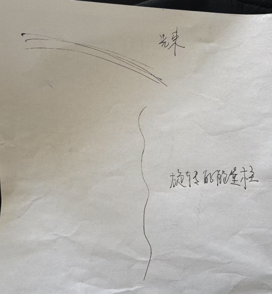 接着,净化正式开始。我感受到自己的脑袋特别疼,好像有人在抓住我的头发往上拎起来我一样。其实打坐时候我是有点低头的,随着音乐我不由得慢慢抬起来头,感觉眼前是非常明亮且有能量的。然后我就看到了有一个光束,从左向右照射,类似于电影院播放电影的那种投光。接着画面又渐渐暗了下来,在右边,有一个灰白色的旋转式的能量柱,在缓缓向上……