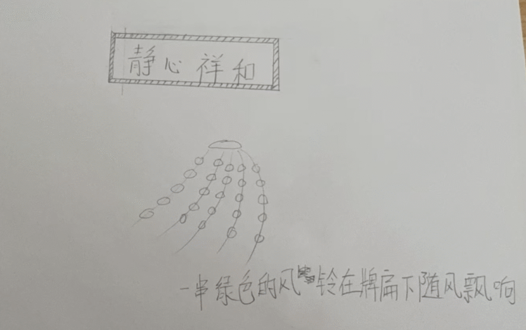 在忏悔的过程中有一瞬间感觉自己失去了意识,隐约看到了一个牌匾,上面写着静心祥和,仿佛听到风铃随风响动的清脆声,让人身心舒适。念完忏悔词后,隐约看到了风铃的样子,就都画下来了。