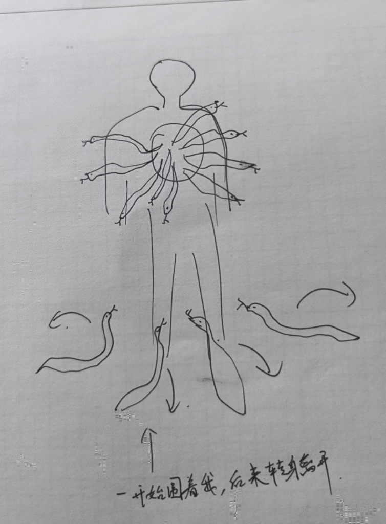 这次的整个过程,我依旧什么都没有看见。画的图也是心底的感觉,当我刚开始忏悔的时候,身边慢慢有蛇群围绕,我席地而坐(实际是躺着在),但它们就看着我吐着信子。随着我慢慢的忏悔,蛇群开始平静,并转身离我而去。我胸口正中不停的有蛇从里面跳出,离开我,我就在那里,很平静。